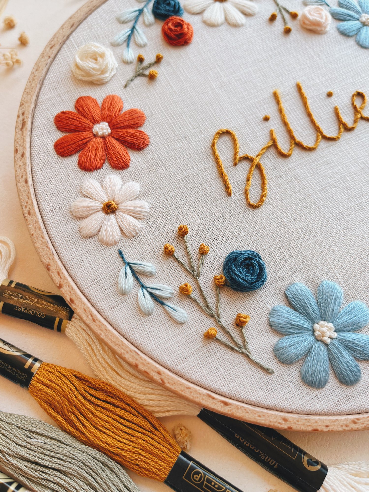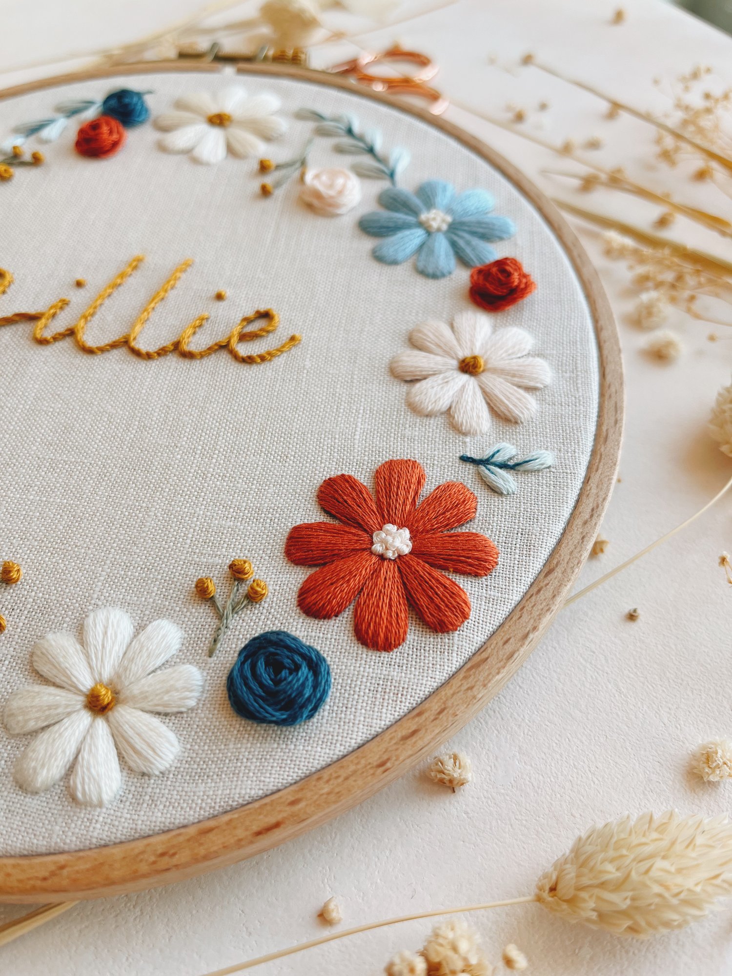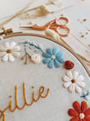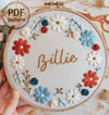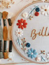 ❤ This customizable hand embroidery pattern features a pastel floral wreath with a baby’s name in the middle.