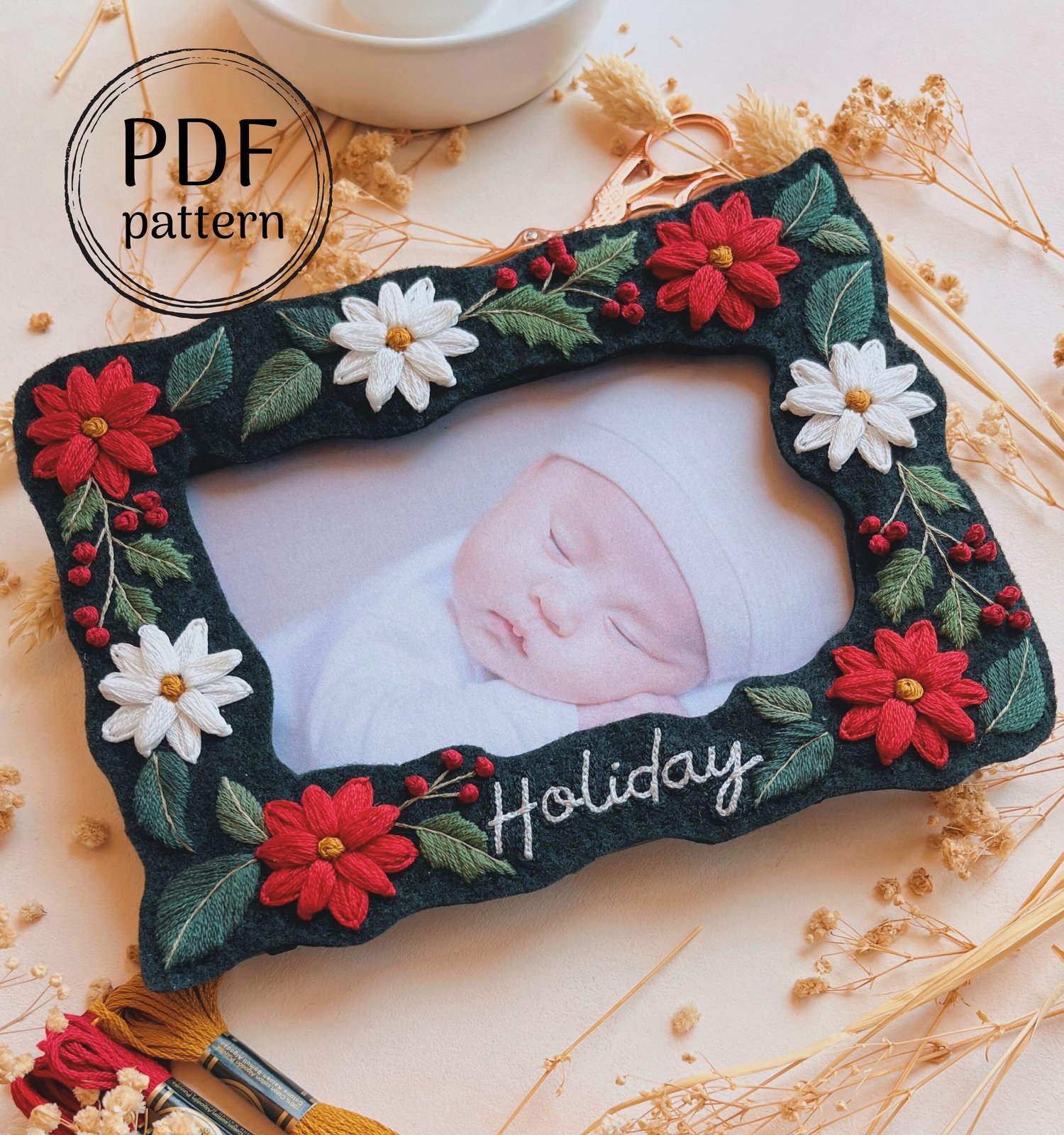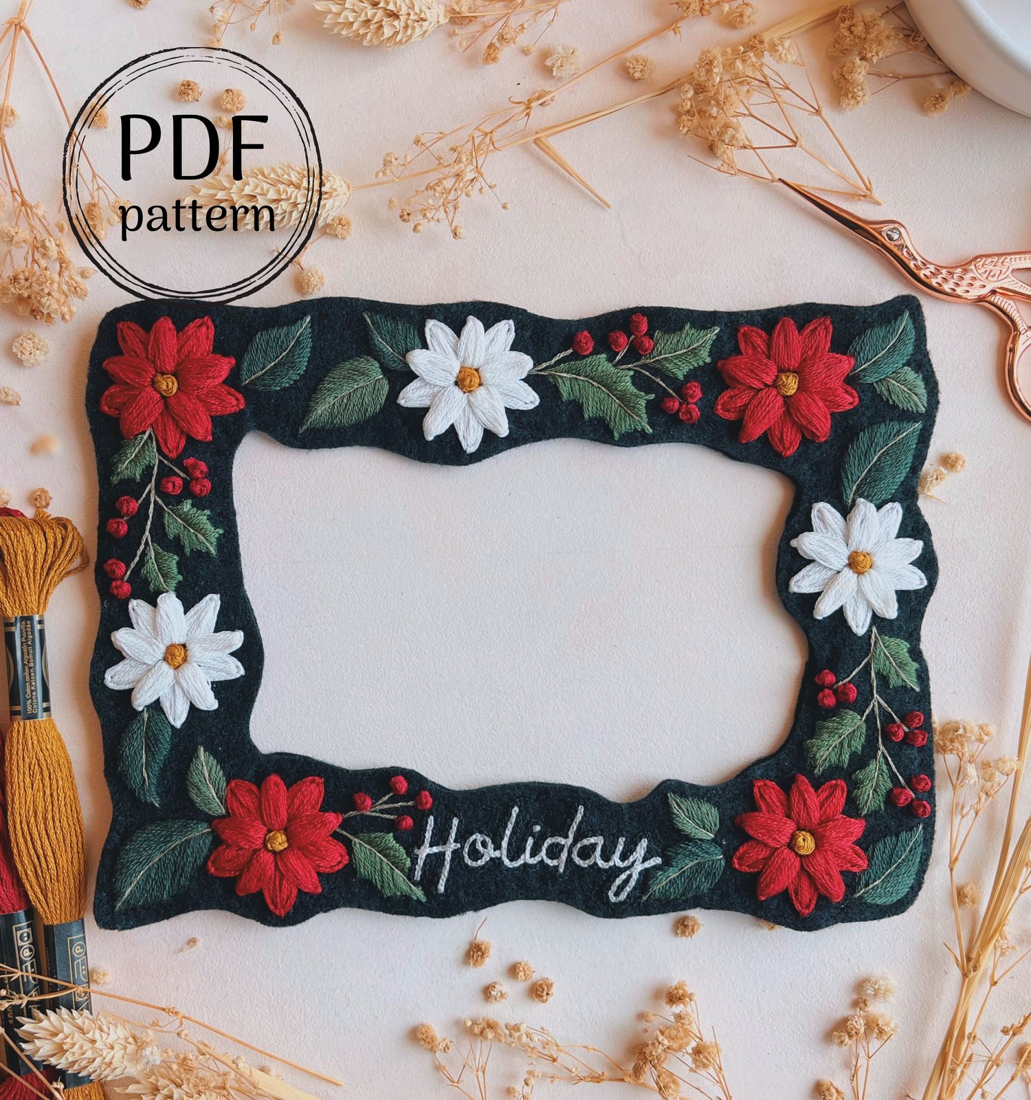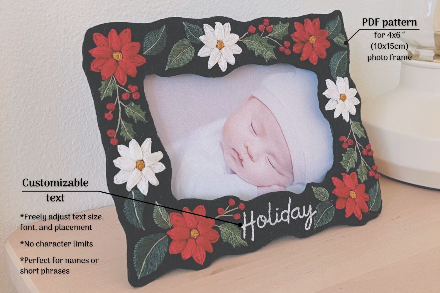 ❤ This hand embroidery pattern features a festive Poinsettia and Holly Berry border, created to fit a 4x6” photo frame. The text is fully customizable — whether it's 'Holiday', a family's name, or a short phrase, you can make it your own!