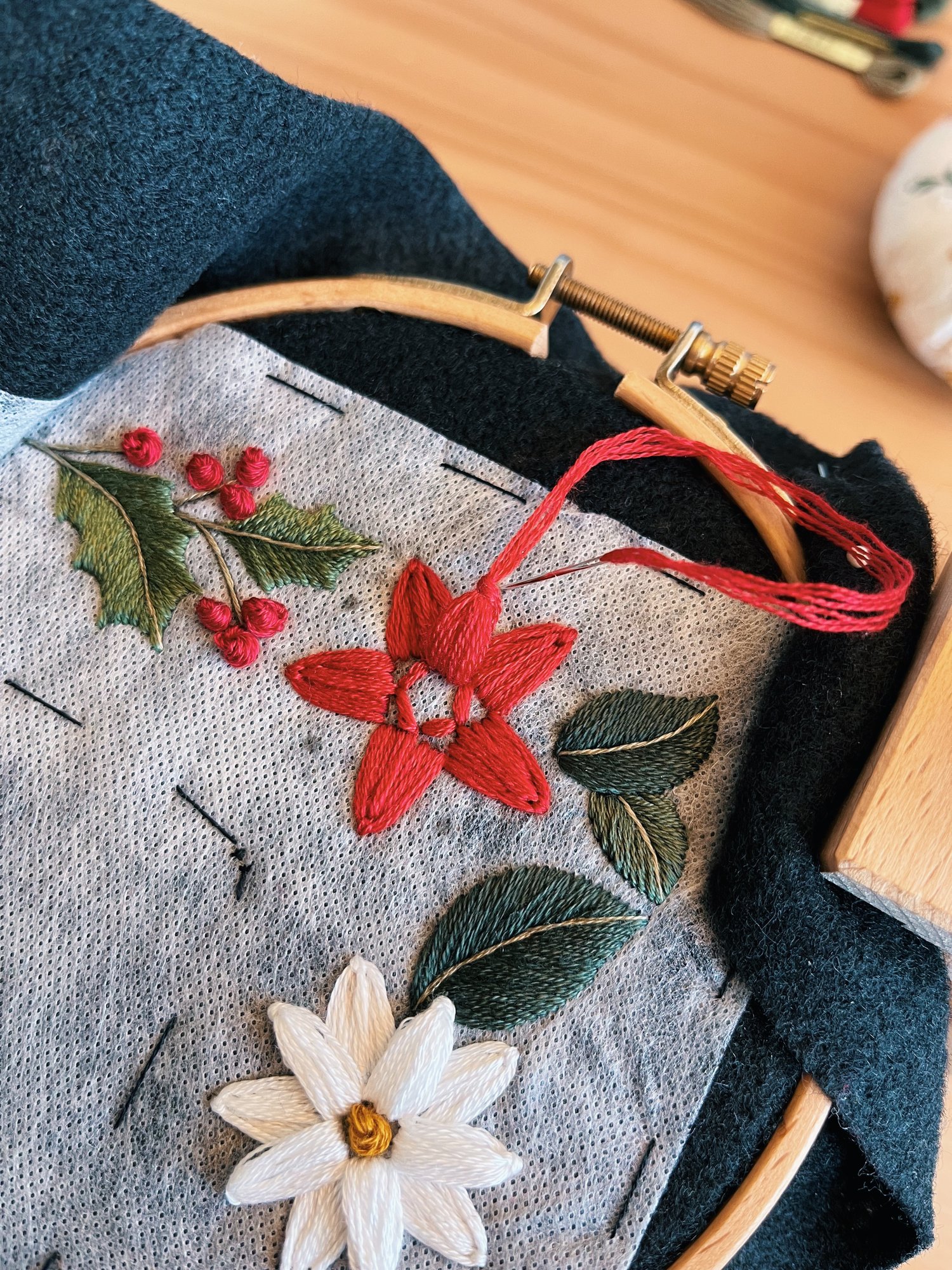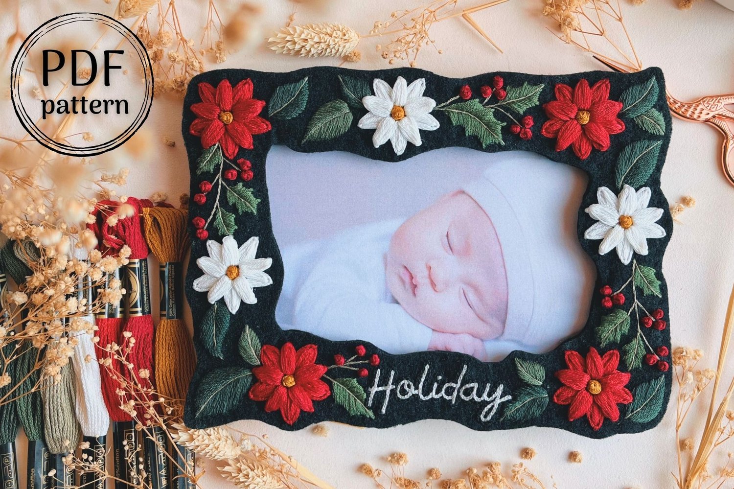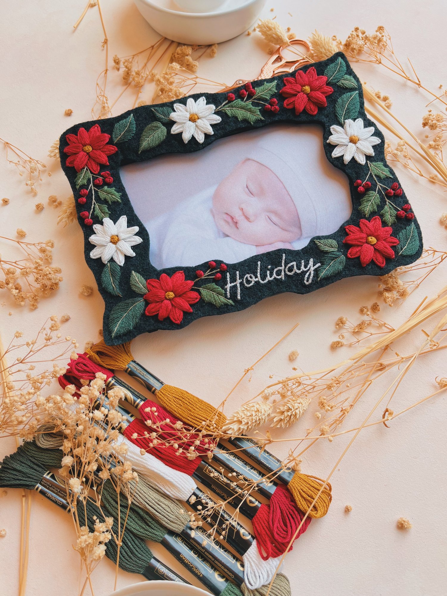 ❤ This hand embroidery pattern features a festive Poinsettia and Holly Berry border, created to fit a 4x6” photo frame. The text is fully customizable — whether it's 'Holiday', a family's name, or a short phrase, you can make it your own!